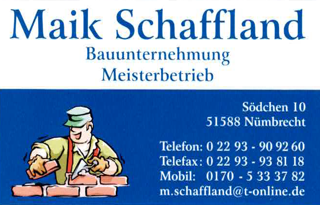 Die Bauunternehmung Maik Schaffland steht für solides Handwerk im Oberbergischen Kreis – vom Erdaushub über den Rohbau bis zu Putz, Pflaster und Außenanlagen. Persönlich, zuverlässig, in Meisterqualität.
